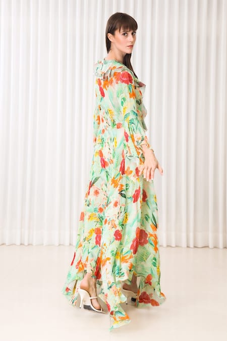 Multi green dress featuring dahila bouquet prints with a high low hem