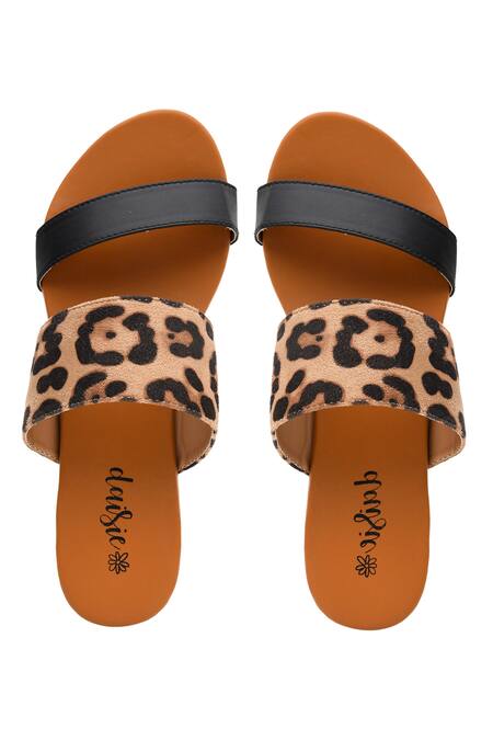 Brown animal printed sliders featuring dual straps and a round toe shape