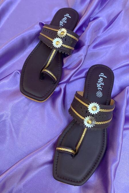 Brown Kolhapuri flats featuring floral embellishments, laser cut details, and a toe ring