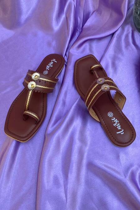 Brown Kolhapuri flats featuring floral embellishments and laser cut details