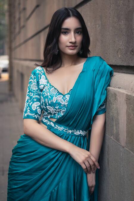 Blue pre-draped saree featuring ruffles and embroidered details. Paired with a floral cutwork padded blouse and attached lining.