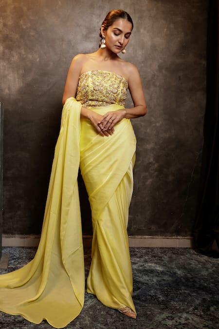 Yellow satin georgette pre-draped saree with an embroidered strapless blouse and cut-dana bead and pearl embellishment.