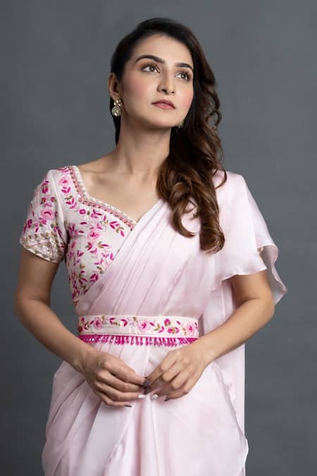Pink pre-draped saree featuring ruffle details and attached inner lining. Paired with a floral hand embroidered blouse and belt.