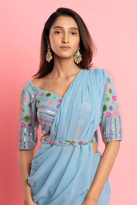 Blue pre-draped saree featuring ruffled layers in georgette with an attached lining. Paired with a sequin and bead embellished padded blouse and a coordinating belt.