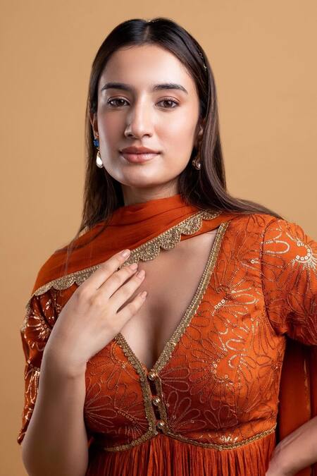 Orange Crepe, Georgette, Silk Embroidery V-neck Rust Anarkali Suit Set