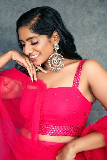 Fuchsia pink tiered lehenga featuring an attached inner lining. Paired with a padded blouse adorned with mirror work and a dupatta with a ruffle border.