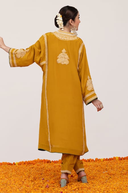 Mustard yellow kurta featuring pop tilla embroidered floral jaali motifs. Paired with embroidered draped pant.