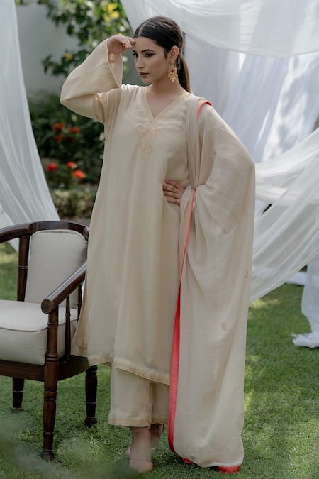 Cream Dupatta Georgette, Phiran And Pant Crepe Kashmiri Tilla Work Kurta Set