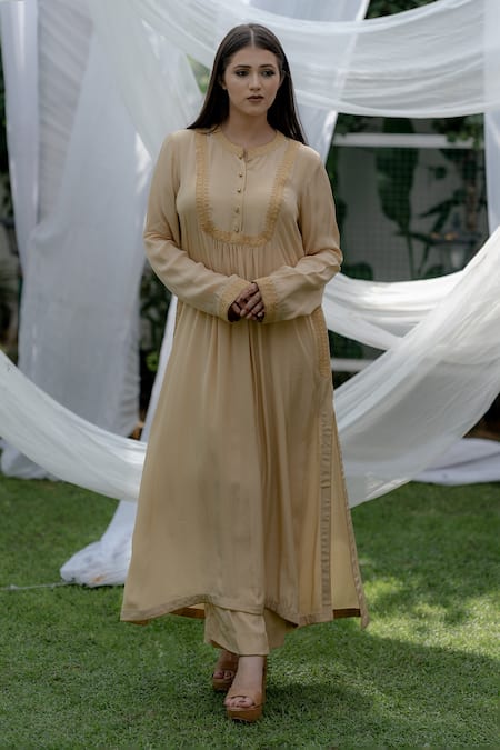 Cream Crepe Kashmiri Tilla Band Collar Work Phiran Kurta Pant Set