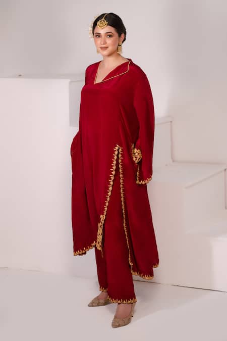 Red phiran featuring Kashmiri tilla embroidery with floral motifs and scalloped edges. Paired with matching pant and includes side pockets.