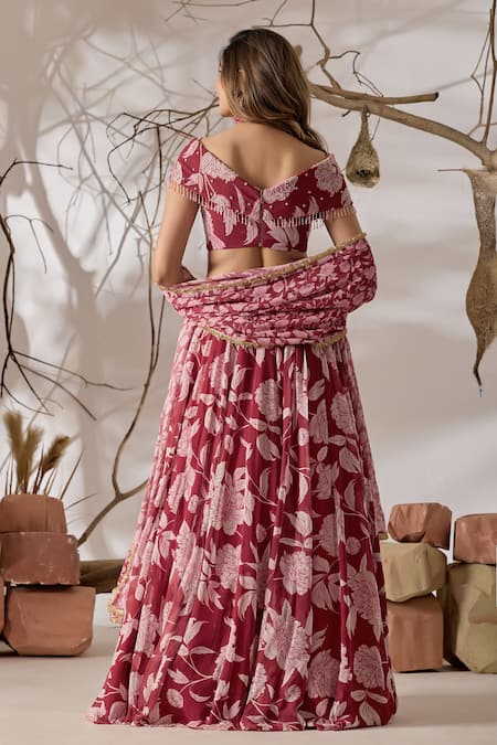 Maroon digital printed viscose georgette lehenga set from the Dori Collection, crafted with hand-highlight embroidery. The blouse features a cross-wrap V neckline with sequin, zari and bead tassel detailing, and the lehenga skirt has an all-over floral print; the set is completed with a matching printed dupatta with an embellished scallop-style border.