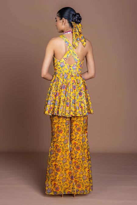 Yellow peplum kurti made of chinon silk featuring floral patterns. Paired with matching sharara pants in jimmy choo silk and a dupatta.