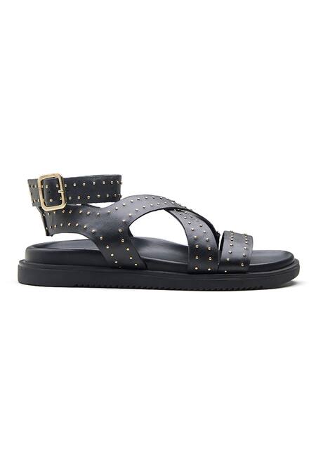 Black flat sandals featuring criss-cross straps adorned with stud embellishments