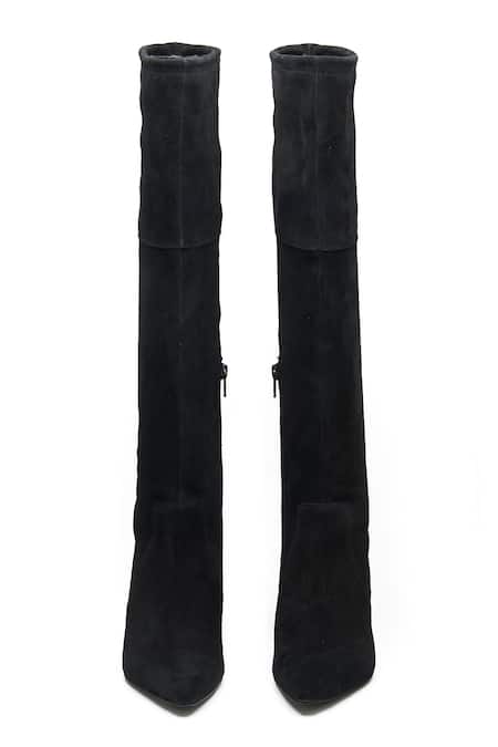 Black suede leather long boots featuring kitten heels and a string tie-up
