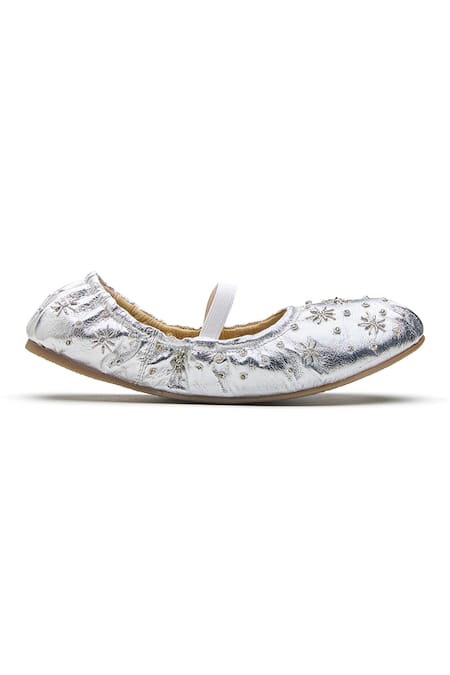 Silver toned ballerinas featuring bloom floral embroidery and an elasticated border