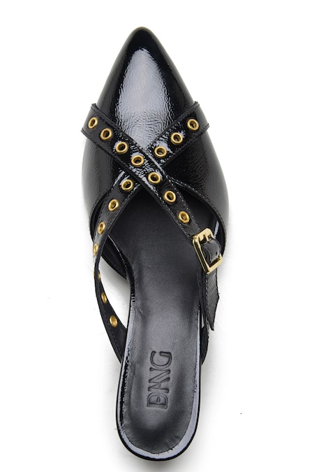 Black patent leather wedges featuring a pointed toe and decorative buckle with gold studs
