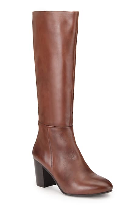 Brown long boots featuring pointed toe detailing and a 3-inch heel