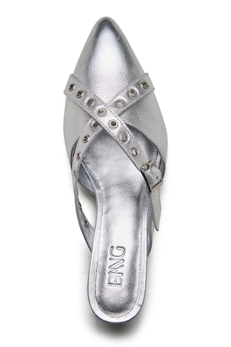 Decorative eyelet details on straps, Pointed toe design, Cross strap with buckle closure