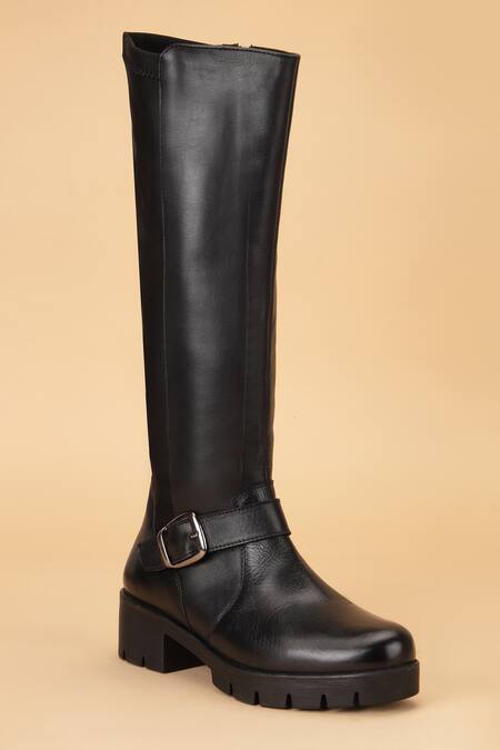 Black long boots made from genuine Argentinian Napa leather featuring stitchline thread embroidered border and buckle detailing in front