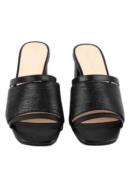 Black block heels featuring foil printed leather, open toe design, and strap detailing