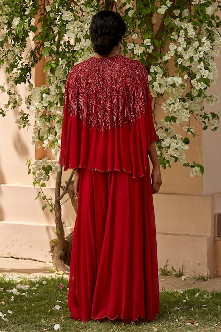 Red cape with sequin & glass bead embroidered motifs. Paired with bustier & sharara pant.