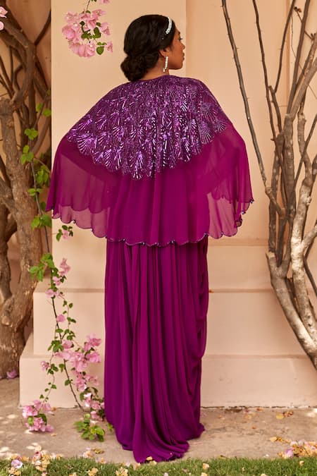 Purple Georgette, Satin Sequin, Glass Bead Open Embroidered Cape With Gown
