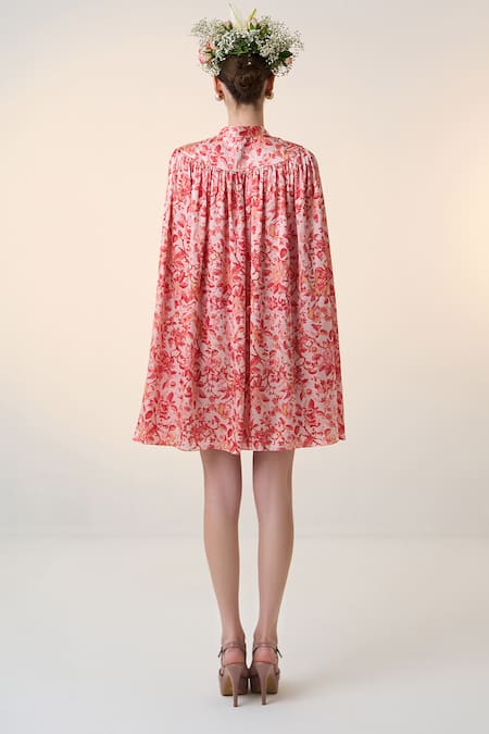 Red Satin Mandarin Collar Rio Floral Print Dress