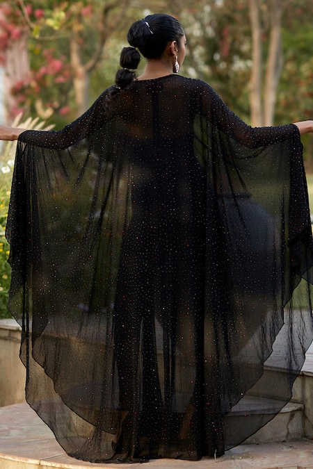 Black cape in georgette fabric base with silver swarovski embellished motifs.