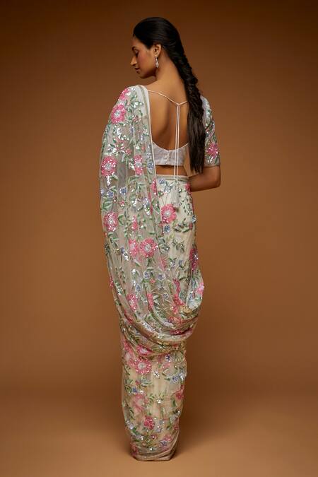 White saree made in tulle base, accentuated with all over flower vine embroidery in sequin & cutdana embellishments. Paired with a blouse.