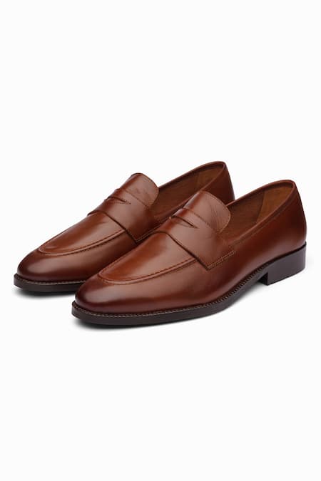 Brown soft unlined penny loafers featuring high-grade rubber sole.