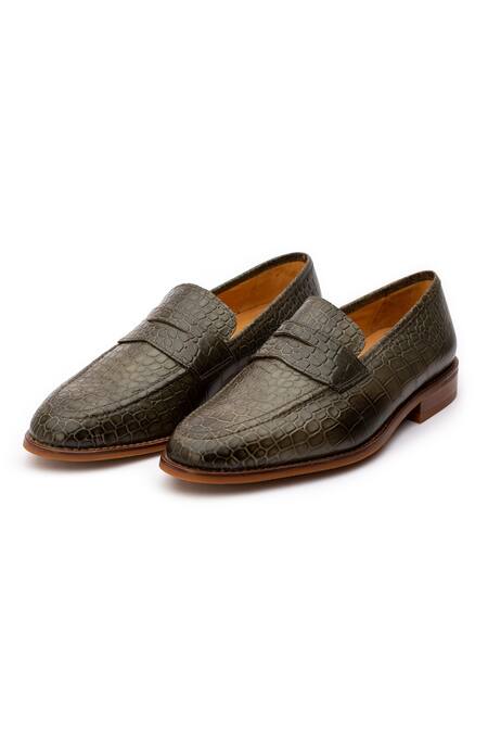 Green Handcrafted Crocodile Pattern Penny Loafers