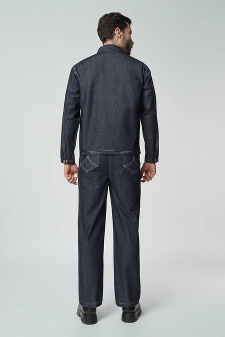 Denim blue jacket featuring placement gold metallic embellishments. Paired with coordinating denim pants.