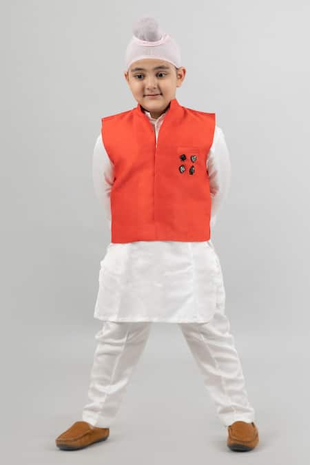 Tomato red chanderi bundi featuring hand embroidered motifs and a band collar