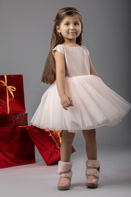 Blush pink dress featuring a shimmer bodice and tulle flared hem