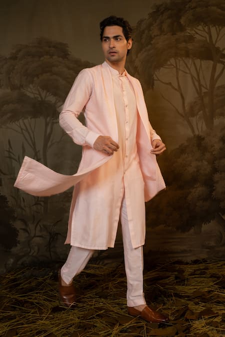 Pink kurta featuring criss cross embroidered patterns and a mandarin collar. Paired with matching pants for a complete look.