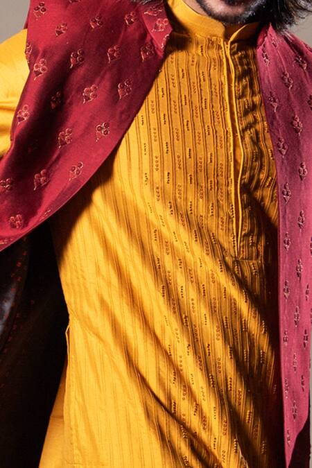 Honey yellow kurta with french knot embroidery, sequin work & pleated detailing. Paired with churidar.