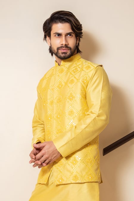Lemon yellow bundi jacket hand embroidered floral motifs & mirror work. Paired with kurta & off-white pant.