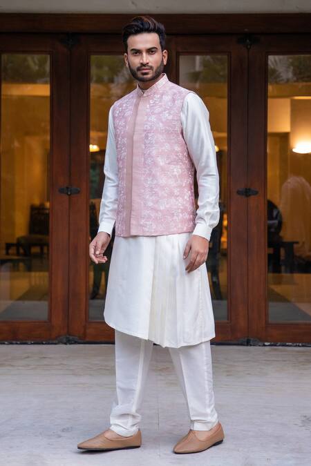 Ivory kurta featuring a unique asymmetrical design and paired with a pink embroidered jacket. The ensemble includes matching payjama for a complete look.