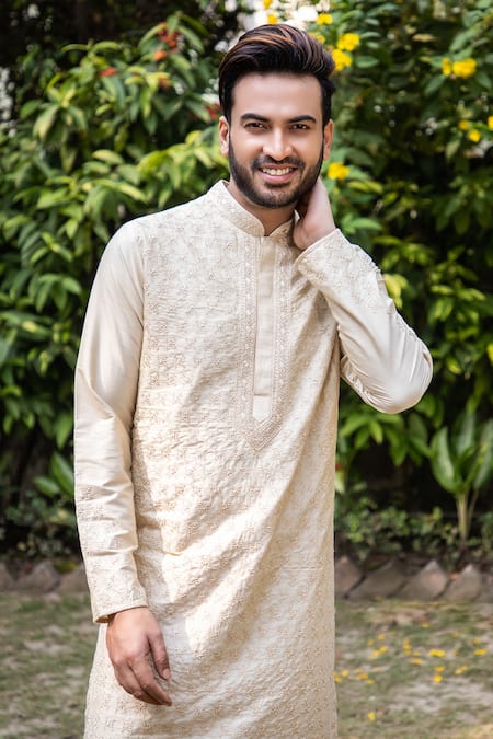 Beige Silk Blend Thread Work Embroidered Kurta Set