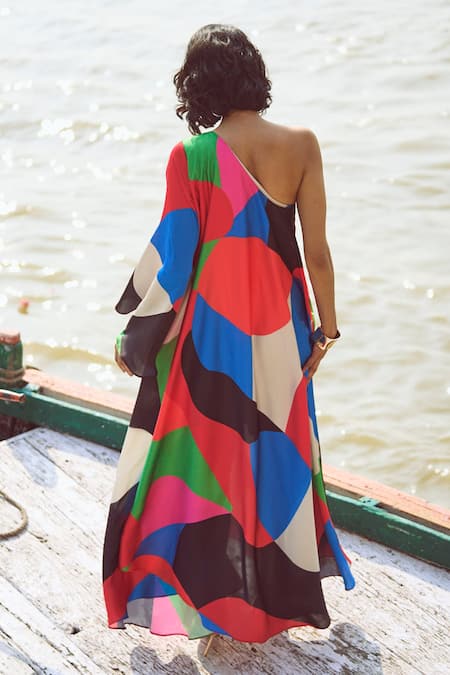 Multicolor abstract print dress featuring a one shoulder neckline and asymmetric sleeves