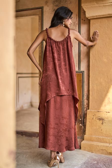 Brown sleeveless top featuring a textured woven pattern and braided beaded strap. Paired with a matching maxi skirt for a cohesive look.