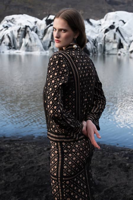 Beige and black jacket featuring rattan inspired laser cut work and a band collar. Paired with a cut work pattern skirt with a side high slit and a bandeau bralette with a solid stretch knit back panel.