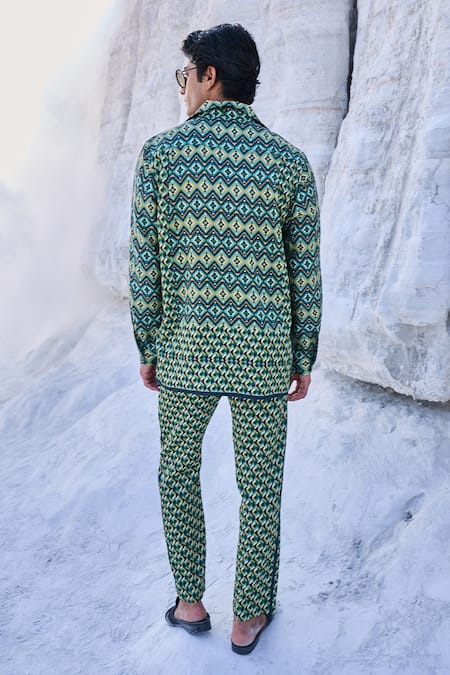 Green popover shirt featuring deco and mosaic printed motifs all-over