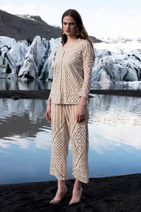 Beige straight pant featuring floral motifs and resham thread embroidery