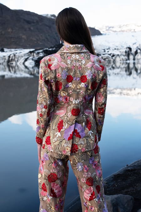 Multi-colored blazer featuring floral embroidery and a shawl lapel
