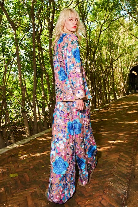 A multi-color blazer crafted from 100% recycled polyester, featuring a shawl collar and variegated botanical thread embroidery with floral motifs.