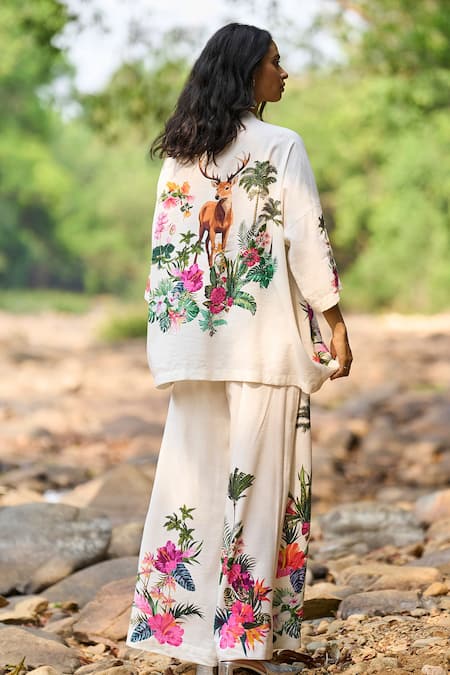 Boxy white linen shirt featuring multicolour floral print motifs on the front and back. Paired with matching wide-legged white linen pant adorned with floral prints tapering from the bottom hem.