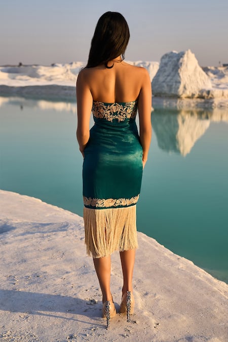 Blue midi dress featuring floral embroidery with a fringed hemline