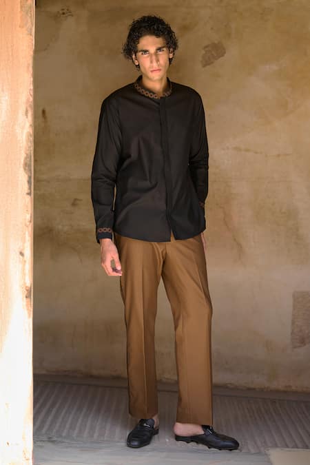 Brown pant featuring thread embroidered geometric motifs and side pockets