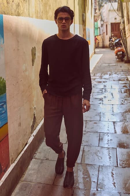 Black high low t-shirt featuring full sleeves and raw hem detailing at the neckline and cuffs. Paired with brown elasticated hem pants for a relaxed fit.